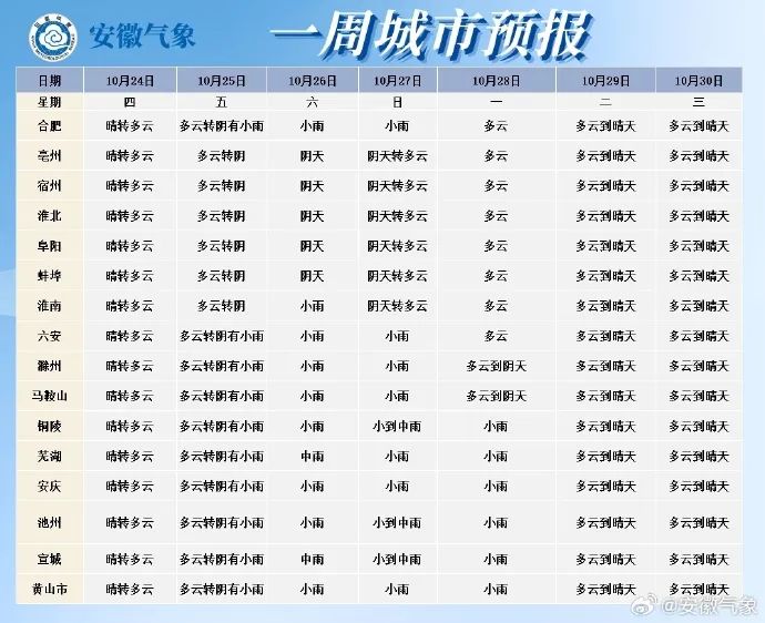 安徽省气象台预计,25日至28日安徽省有一次降水过程,其中26日至27日淮河以南有小雨,沿江江南部分地区中到大雨;其余时间全省以多云到晴天气为主。