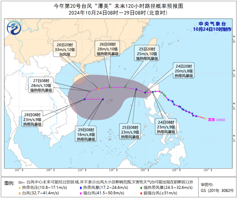 今年第20号台风“潭美”已于今天(24日)凌晨1点钟前后在菲律宾吕宋岛东北部沿海登陆,登陆时中心附近最大风力有10级(25米/秒,强热带风暴级)。
