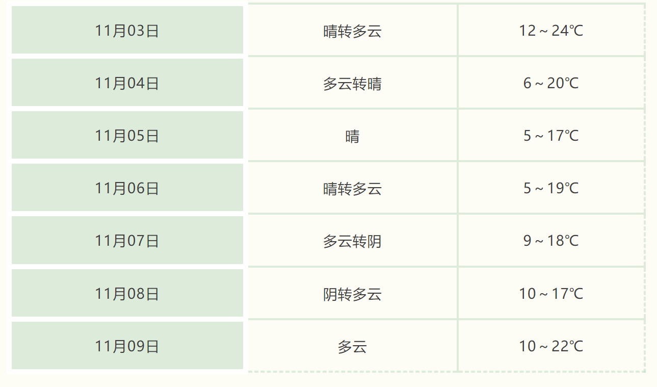 据市气象部门最新预报显示,下周我市都会以晴到多云天气为主,从11月3日夜里到5日受冷空气影响,我市偏北风逐渐增大至3~4级,阵风6级左右,平均气温下降5℃左右。
