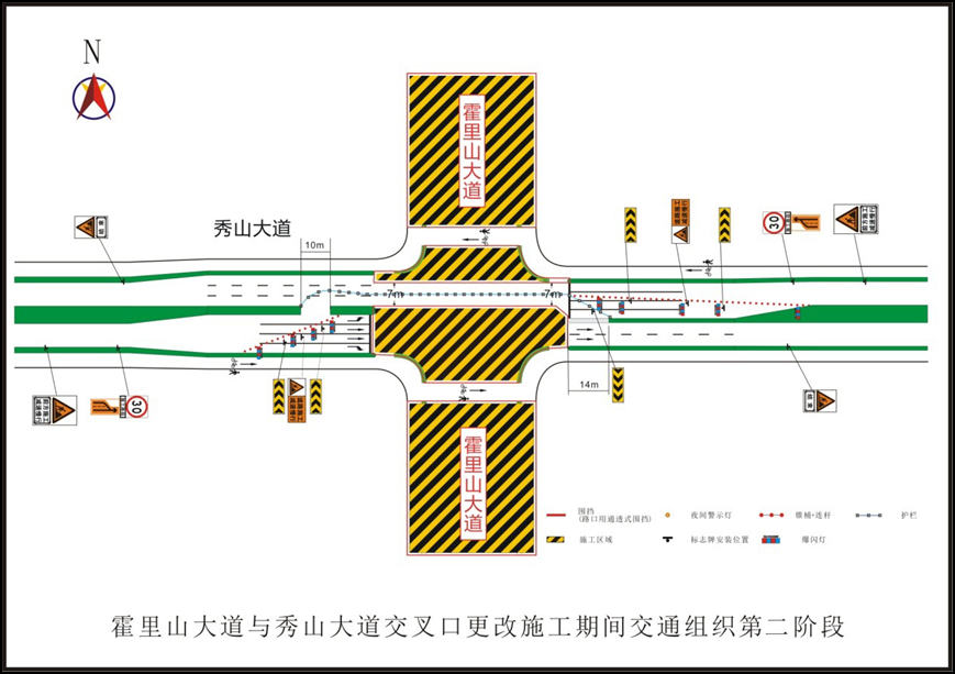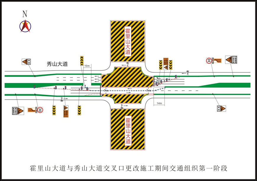 秀山大道与霍里山大道交叉口东西方向机动车由双向4车道调整为双向2 车道;东西方向非机动车及行人从道路南北两侧非机动车道通行。具体变化见下图: