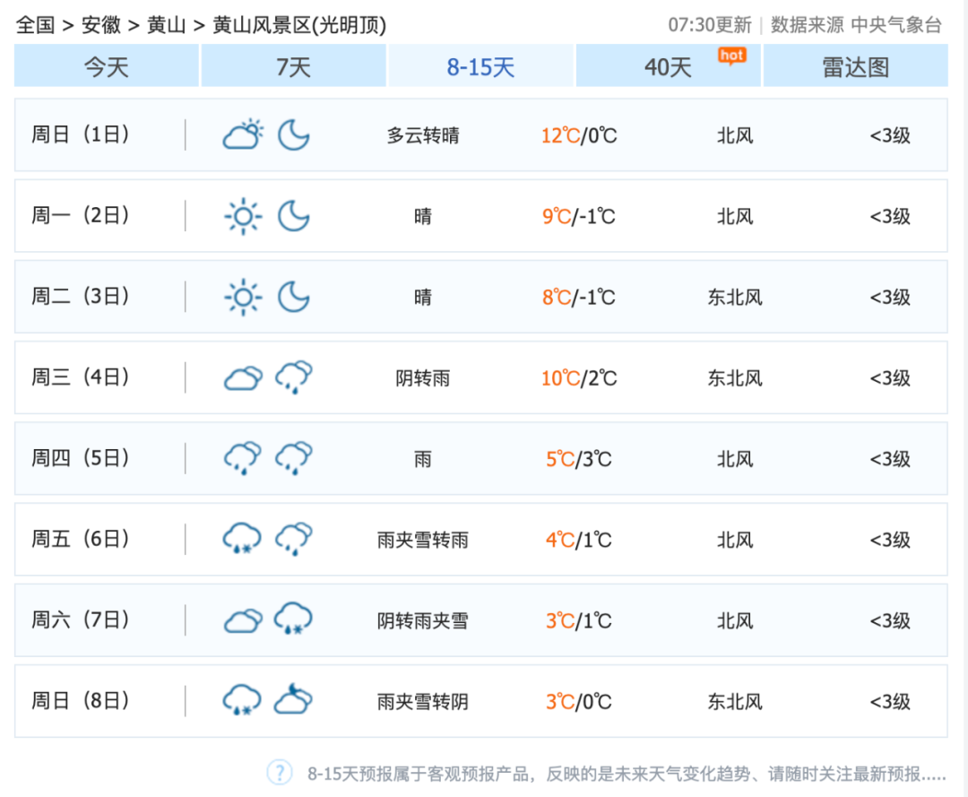 据安徽气象台消息:25-27日有一次强冷空气影响我省,全省平均气温将下降7~9℃,同时偏北风力增强至4级,阵风6~7级,山区和水面阵风8~9级。冷空气过后,28日早晨本省山区最低气温-2~0℃;其他地区1~3℃。28-30日我省气温逐渐回升,30日全省最高气温16~19℃。24-25日全省阴天有小雨,其中25日沿江江南部分地区中雨;26-30日全省以晴到多云天气为主。据中央气象台今早预报,黄山风景区将于12月6日迎来雨夹雪天气,具体以临近天气预报为准。