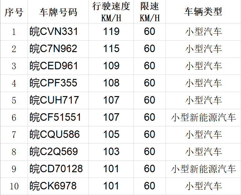 在此次曝光的超速车辆中,皖CVN331在限速60公里/小时的路段,超速至119公里/小时,超速98.3%。