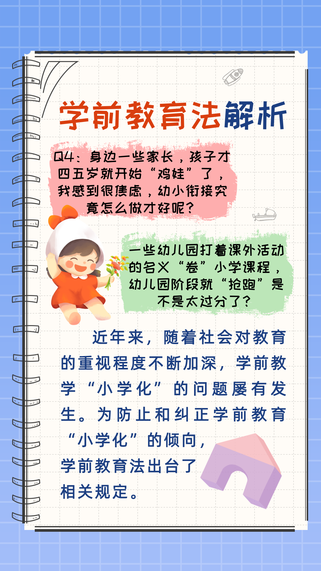关于即将入园和已经入园的娃们,宝爸宝妈们总有很多焦虑和担心,一起看看学前教育法都给出了哪些回应和解答:
