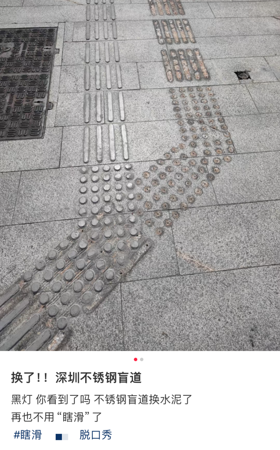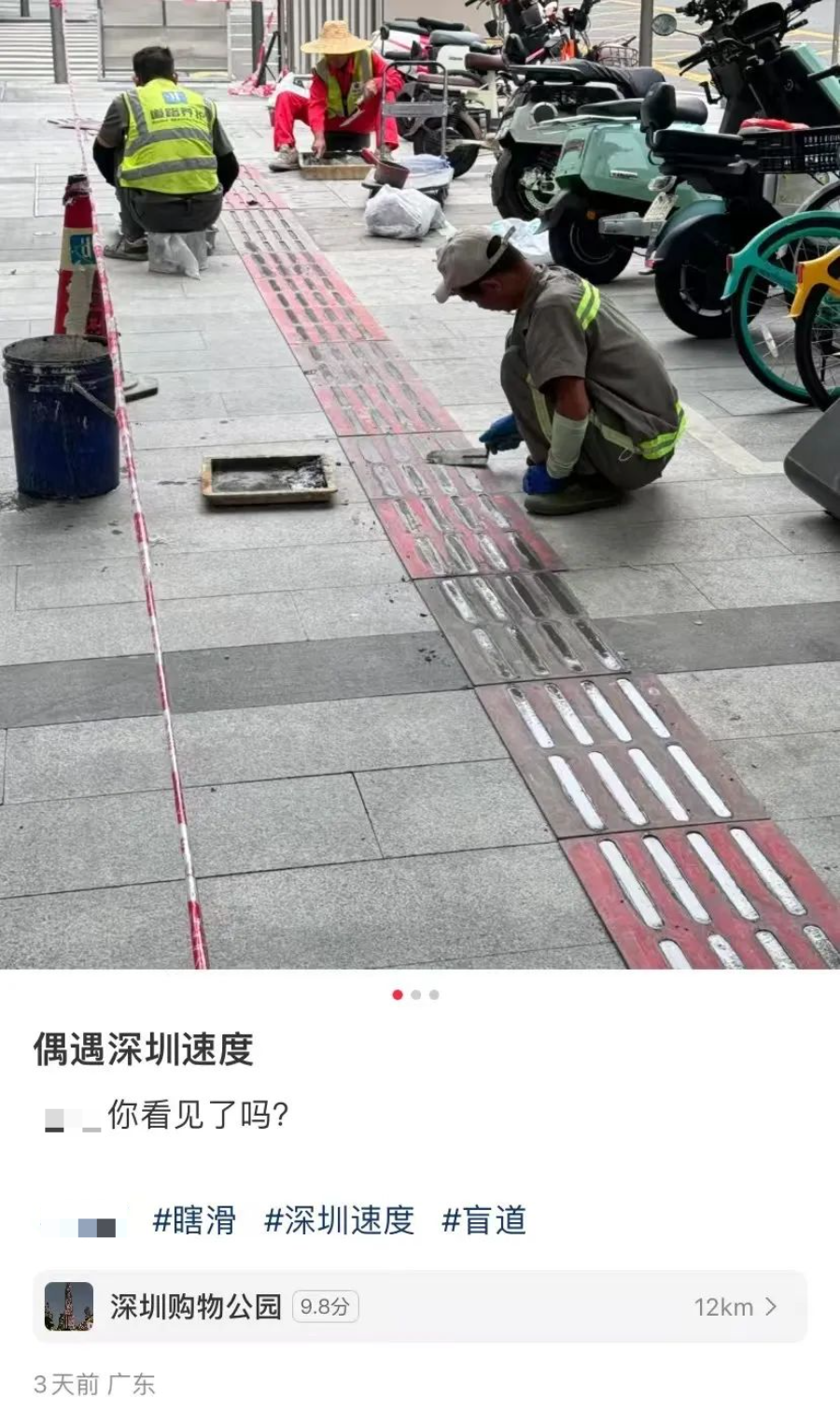 有网友反映深圳国际会展中心附近盲道存在破损情况,宝安管理局迅速刷涂防滑性能更好的仿标线材质盲道