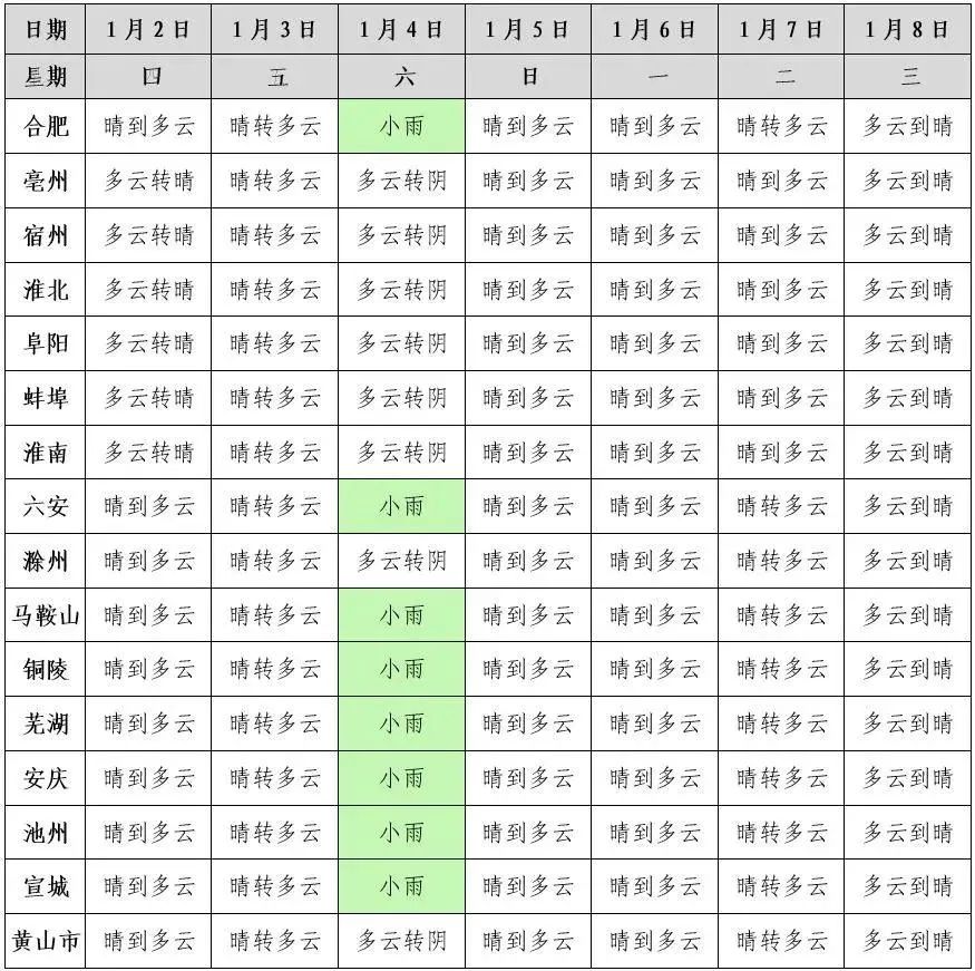 4日:全省多云到阴天,淮河以南部分地区有小雨。