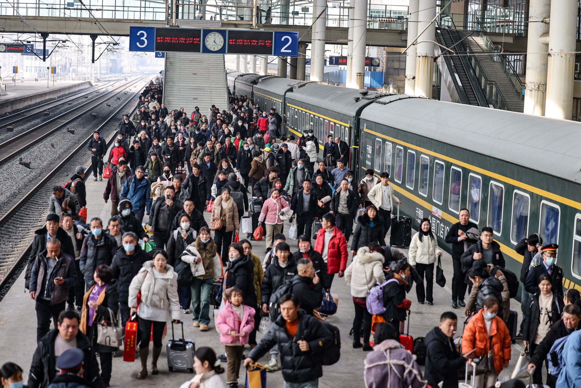 蚌埠发布客户端讯 (融媒体记者 陈昂 文图)1月21日中午 12 时 13 分,冬日的暖阳洒在蚌埠火车站的站台上,K5828 次临时旅客列车缓缓驶入 2 号站台。列车刚停稳,各个车厢的车门便迅速打开,一时间,人群如潮水般涌动而出。1700 多名旅客带着归心似箭的神情,脚步匆匆却又秩序井然地走下列车。他们中,有的拉着鼓鼓囊囊的行李箱,轮子在地面上发出 “咕噜咕噜” 的声响;有的背着沉甸甸的背包,手里还拎着装满年货的袋子,脸上洋溢着回家的喜悦。