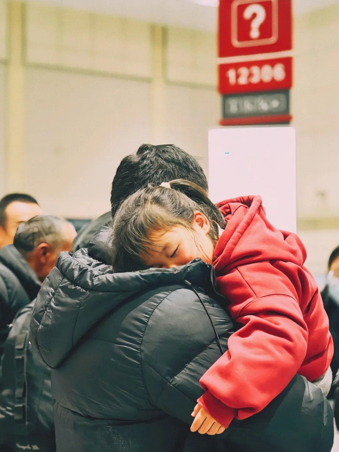 凌晨的襄阳站里,女儿在爸爸肩头熟睡。刘娟 摄