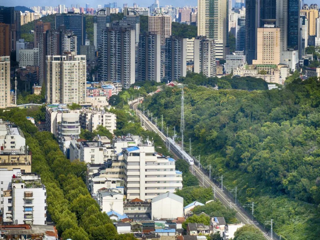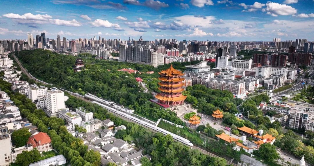 动车组列车从黄鹤楼旁驶过。邹政 摄