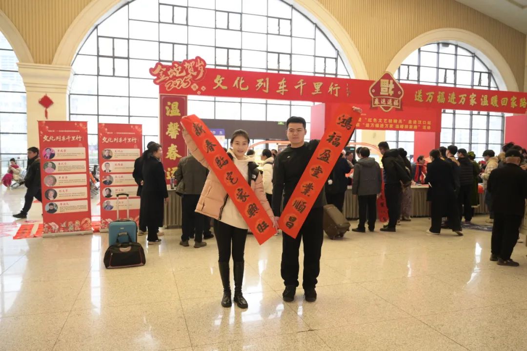 在汉口站,旅客收到书法家题写的春联。魏铁兵 摄