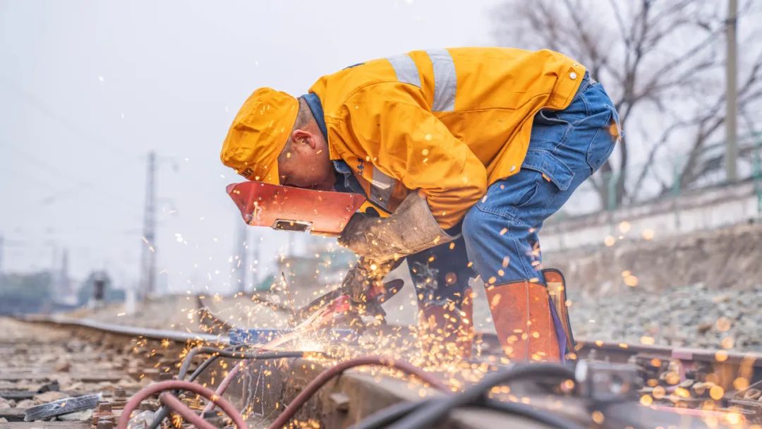 信阳工务段线路工对信阳站编组场内道岔进行岔心焊补作业。于海龙 摄
