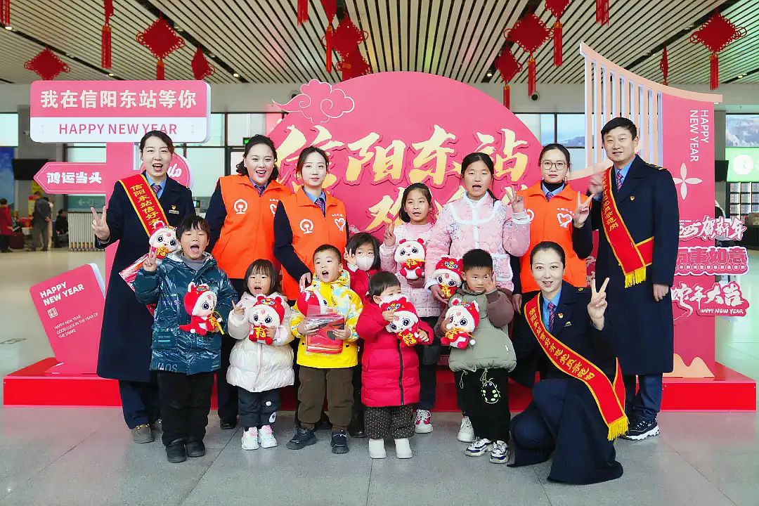 信阳东站工作人员和“小桔灯”志愿者与小旅客们合影留念。姚宇翔 摄