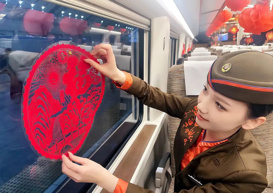 乘务员精心布置车厢,营造喜庆氛围。彭琦 摄