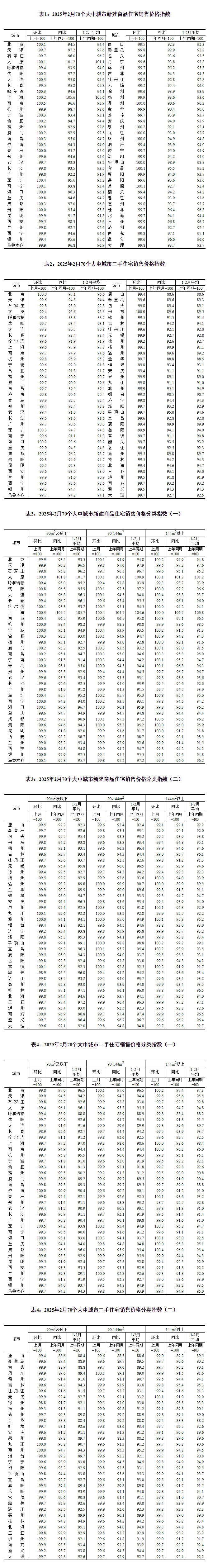 一、各线城市商品住宅销售价格环比总体稳中略降,其中一线城市新建商品住宅环比继续上涨2月份,一线城市新建商品住宅销售价格环比上涨0.1%,涨幅与上月相同。其中,北京、上海和深圳分别上涨0.1%、0.2%和0.4%,广州下降0.2%。一线城市二手住宅销售价格环比由上月上涨0.1%转为下降0.1%。其中,深圳上涨0.3%,北京持平,上海、广州分别下降0.4%和0.3%。2月份,二线城市新建商品住宅销售价格环比由上月上涨0.1%转为持平;二手住宅环比下降0.4%,降幅比上月扩大0.1个百分点。三线城市新建商品住宅销售价格环比下降0.3%,降幅扩大0.1个百分点;二手住宅环比下降0.4%,降幅与上月相同。二、各线城市商品住宅销售价格同比降幅均继续收窄2月份,一线城市新建商品住宅销售价格同比下降3.0%,降幅比上月收窄0.4个百分点。其中,上海上涨5.6%,北京、广州和深圳分别下降5.5%、7.8%和4.4%。一线城市二手住宅销售价格同比下降4.9%,降幅收窄0.7个百分点,其中北京、上海、广州和深圳分别下降2.9%、2.1%、9.4%和5.3%。2月份,二线城市新建商品住宅和二手住宅销售价格同比分别下降4.7%和7.4%,降幅比上月分别收窄0.3个和0.2个百分点。三线城市新建商品住宅和二手住宅销售价格同比分别下降5.9%和8.0%,降幅分别收窄0.1个和0.2个百分点。注释:70个大中城市房地产价格统计一二三线城市划分:一线城市指北京、上海、广州、深圳等4个城市;二线城市指天津、石家庄、太原、呼和浩特、沈阳、大连、长春、哈尔滨、南京、杭州、宁波、合肥、福州、厦门、南昌、济南、青岛、郑州、武汉、长沙、南宁、海口、重庆、成都、贵阳、昆明、西安、兰州、西宁、银川、乌鲁木齐等31个城市;三线城市指唐山、秦皇岛、包头、丹东、锦州、吉林、牡丹江、无锡、徐州、扬州、温州、金华、蚌埠、安庆、泉州、九江、赣州、烟台、济宁、洛阳、平顶山、宜昌、襄阳、岳阳、常德、韶关、湛江、惠州、桂林、北海、三亚、泸州、南充、遵义、大理等35个城市。