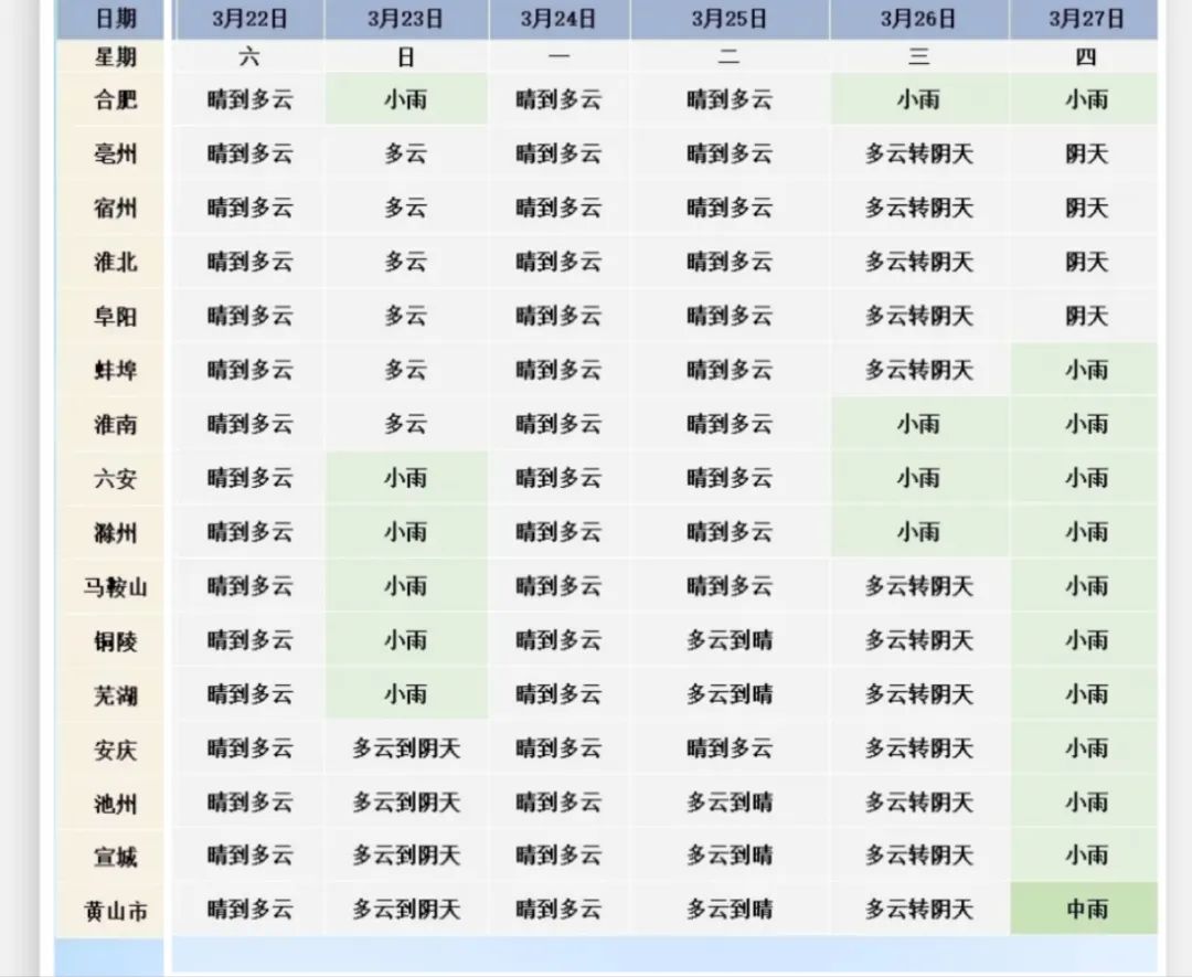23日(周日):淮北地区多云;淮河以南多云到阴天,江淮之间南部和沿江部分地区有小雨。