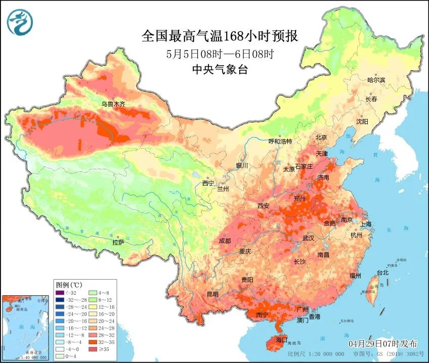 5月1日:江北晴天;江南多云到晴天,南部有阵雨或雷雨。