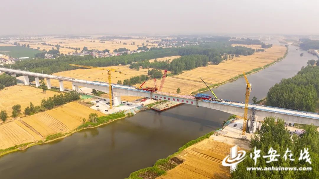 5月29日上午8点,阜淮城际铁路二标跨涡河特大桥180米钢混连续梁顺利合龙,标志着项目全线桥梁贯通,为后续无砟轨道施工打下坚实基础,项目进入最后冲刺阶段。
