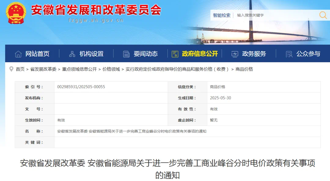 近日,安徽省发展和改革委员会网站发布《安徽省发展改革委 安徽省能源局关于进一步完善工商业峰谷分时电价政策有关事项的通知》,全文如下: