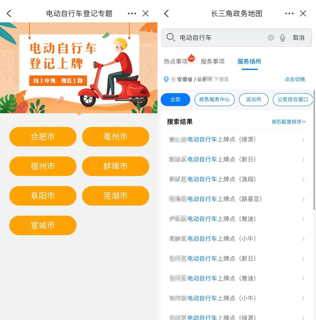 在服务页面点击“电动自行车登记上牌服务”版块,可办理电动自行车登记上牌和上牌网点查询等。