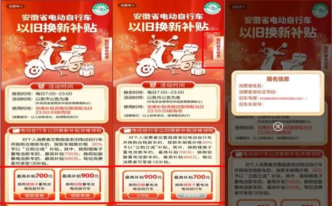 ④ 领取补贴资格后,到店交旧车时,点击右上角“我的报名信息”向商家展示报名信息,在订单支付环节可按规定标准享受政府补贴。(注:用户需下载云闪付App)