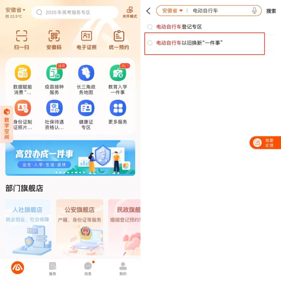① 登录并注册“皖事通”App首页搜索关键词“电动自行车”,选择“电动自行车以旧换新一件事”点击进入。
