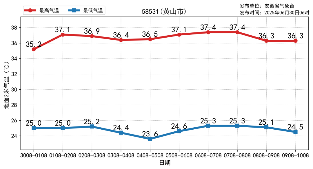 未来十天淮北、合肥、黄山市逐日最高、最低气温预报