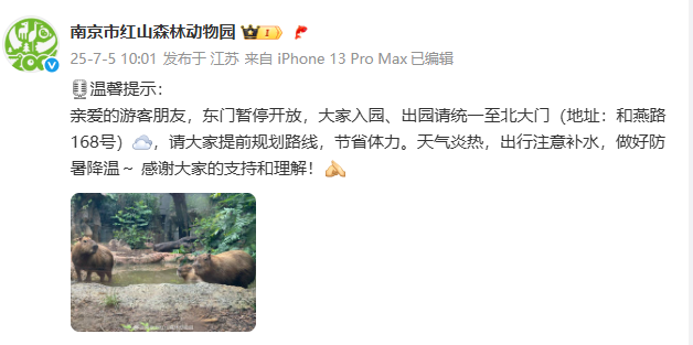 亲爱的游客朋友,东门暂停开放,大家入园、出园请统一至北大门(地址:和燕路168号),请大家提前规划路线,节省体力。天气炎热,出行注意补水,做好防暑降温~感谢大家的支持和理解!