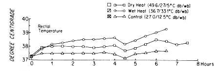而换到湿热环境(湿球温度 33.1°C),汗水的排出蒸发减弱,每小时只蒸发 0.7 升左右。虽然环境温度比干热低,可核心体温上升更快更高,第六个小时甚至超过了 39°C,快要中暑了。