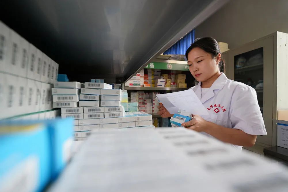 河北省柏乡县龙华镇卫生院药房工作人员在为患者取药。新华社记者 牟宇 摄
