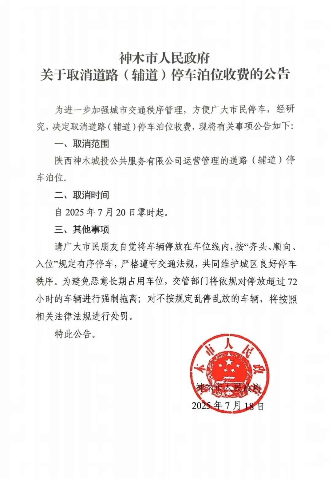 7月19日,陕西省神木市人民政府发布《关于取消道路(辅道)停车泊位收费的公告》,公告显示,为进一步加强城市交通秩序管理,方便广大市民停车,经研究,决定取消道路(辅道)停车泊位收费,取消范围为“神木市城投公共服务有限公司运营管理的道路(辅道)停车泊位”。
