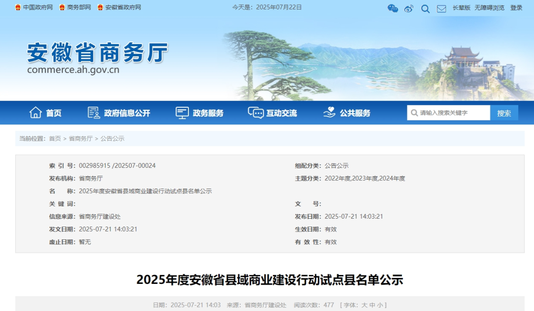 根据《财政部办公厅 商务部办公厅 国家乡村振兴局综合司关于支持实施县域商业建设行动的通知》(财办建〔2022〕18号)和《安徽省商务厅 安徽省财政厅关于实施2025年度县域商业建设行动的通知》(皖商办建函〔2024〕357号)要求,现将2025年度县域商业建设行动试点县入选名单公示如下: