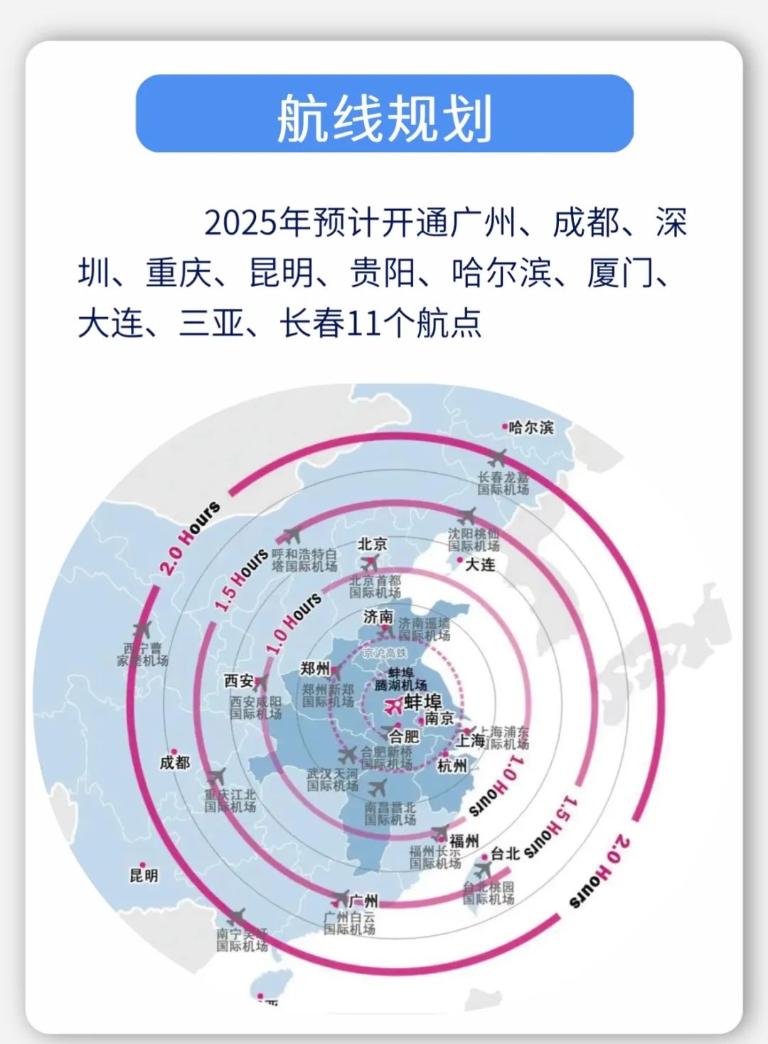 大连、珠三角、云贵川等11个航点(以上为预计航线规划 最终开通航线以蚌埠机场公布为准)