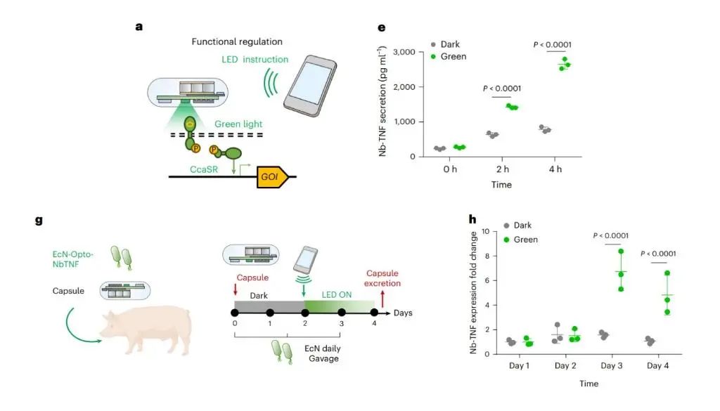 研究人员选择肠道中不存在的光信号作为“加密语言”:一方面,改造益生菌使其能根据肠道炎症标志物(如硝酸根)发光,胶囊的光电传感器将光信号转化为电信号,经无线传输至手机App,让人类“读懂”菌群的实时状态;另一方面,胶囊通过LED发出绿光指令,调控工程菌表达抗炎蛋白等治疗物质,实现精准干预。