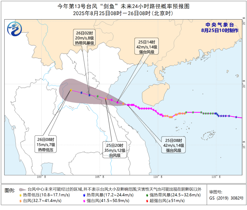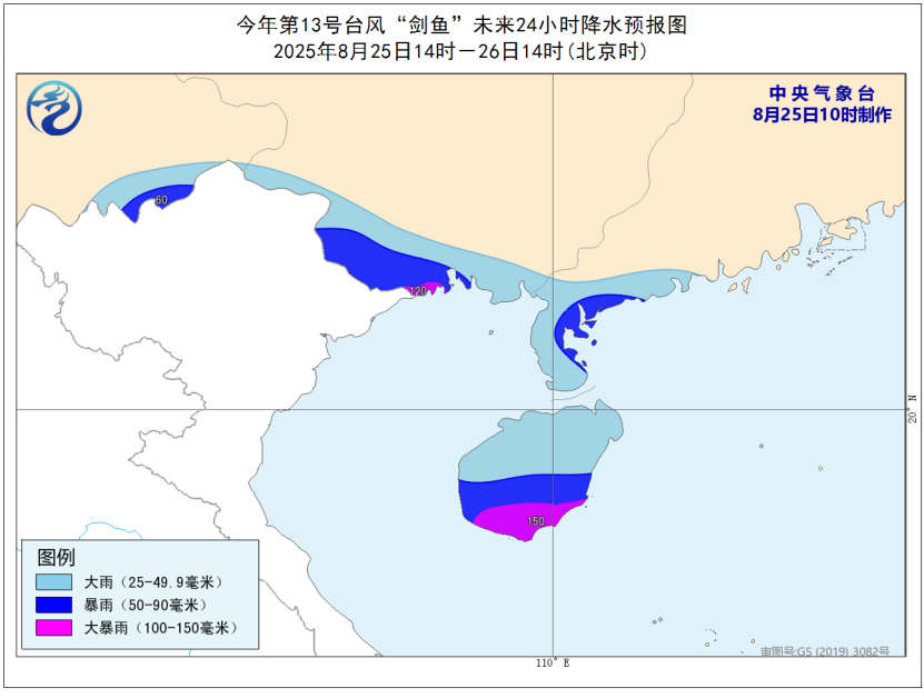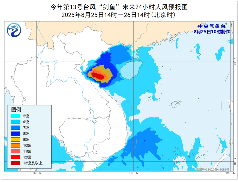 大风预报:8月25日14时至26日14时,南海西部、西沙群岛附近海域、北部湾、琼州海峡、海南岛沿海、广西沿海、广东西部沿海将有6-8级大风,其中北部湾南部海域的风力有9-11级、阵风12-13级,“剑鱼”中心经过的附近海域或地区风力可达12-14级、阵风15-16级。