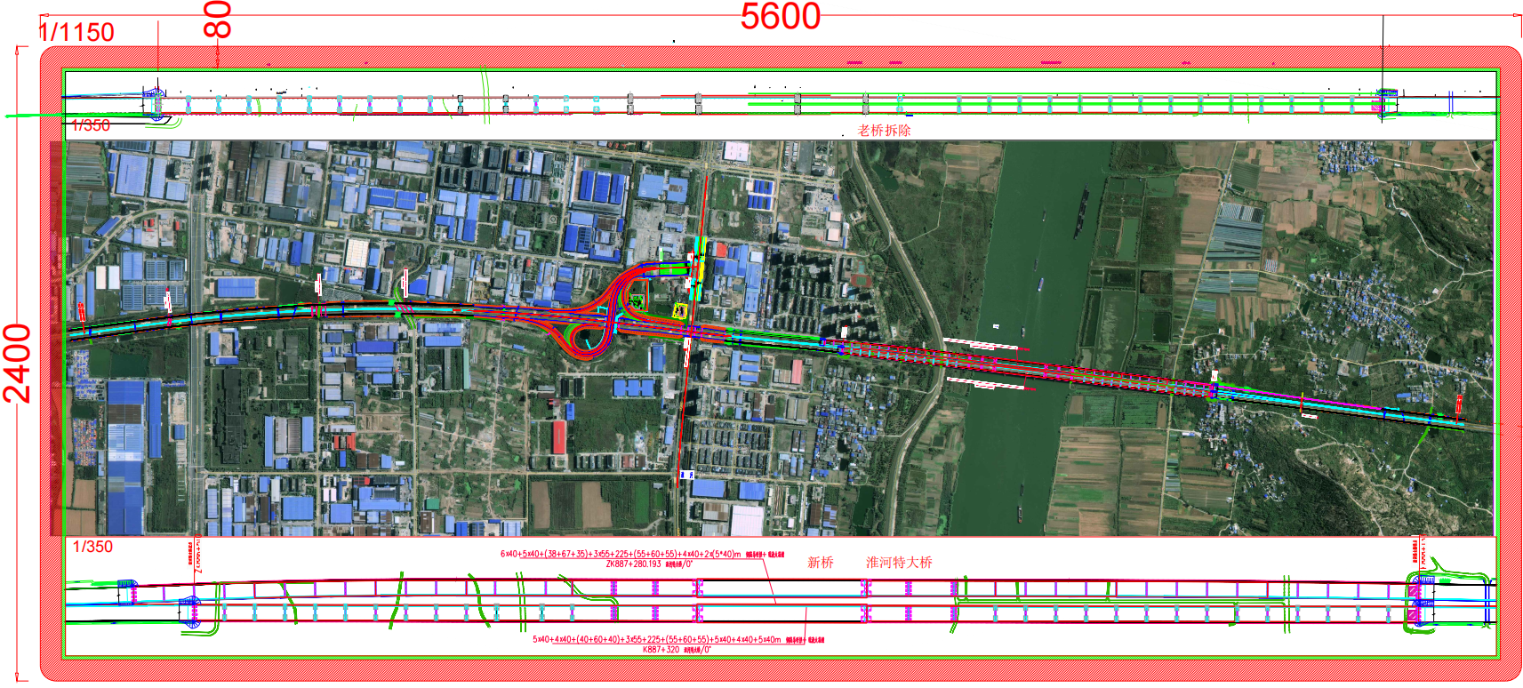 贵州路桥集团有限公司承建的G3京台高速公路大刘郢枢纽至蚌埠互通段改扩建工程LJLM-02标段位于怀远县和禹会区境内,起讫桩号为K883+200~K889+200,路线全长6km。项目起于怀远县世纪大道北侧,主线下穿世纪大道后上跨兴业路、乳泉大道和禹都大道(G329),在淮河设淮河特大桥跨越淮河,终于禹会区涂山村。全线采用双向八车道高速公路标准改扩建,设计速度120km/h。整体式路基宽度42m,单侧分离新建段路基宽度20.75m。主要结构物为淮河特大桥,主跨为225m的下承式钢箱系杆拱桥,引桥采用38m~67m跨径窄钢箱组合梁、40m跨径钢板组合梁及40m预制T梁。其余结构物为中小桥1座,中桥4座,人行天桥1座,拆除主跨90m+130m+90m连续刚构桥。