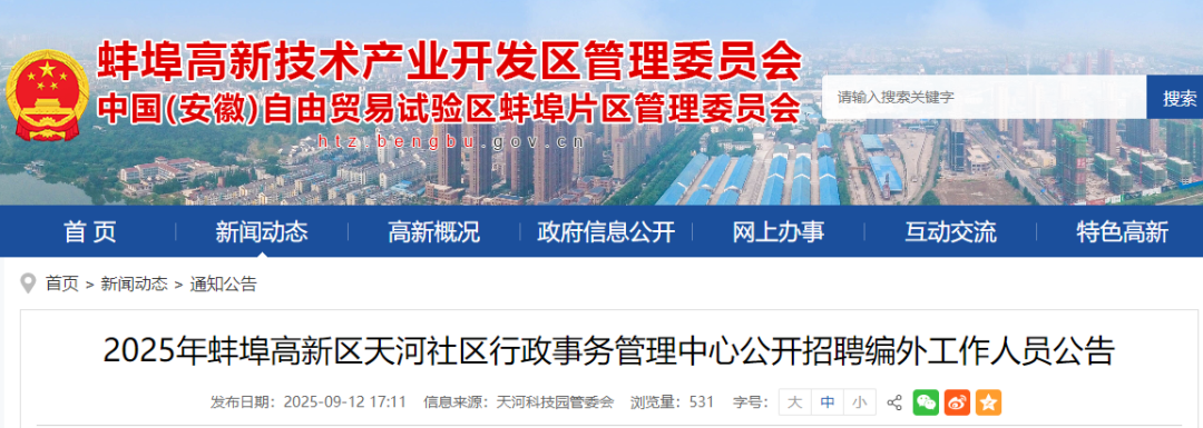 招聘公告在蚌埠高新技术产业开发区网站(http://htz.bengbu.gov.cn/)发布。