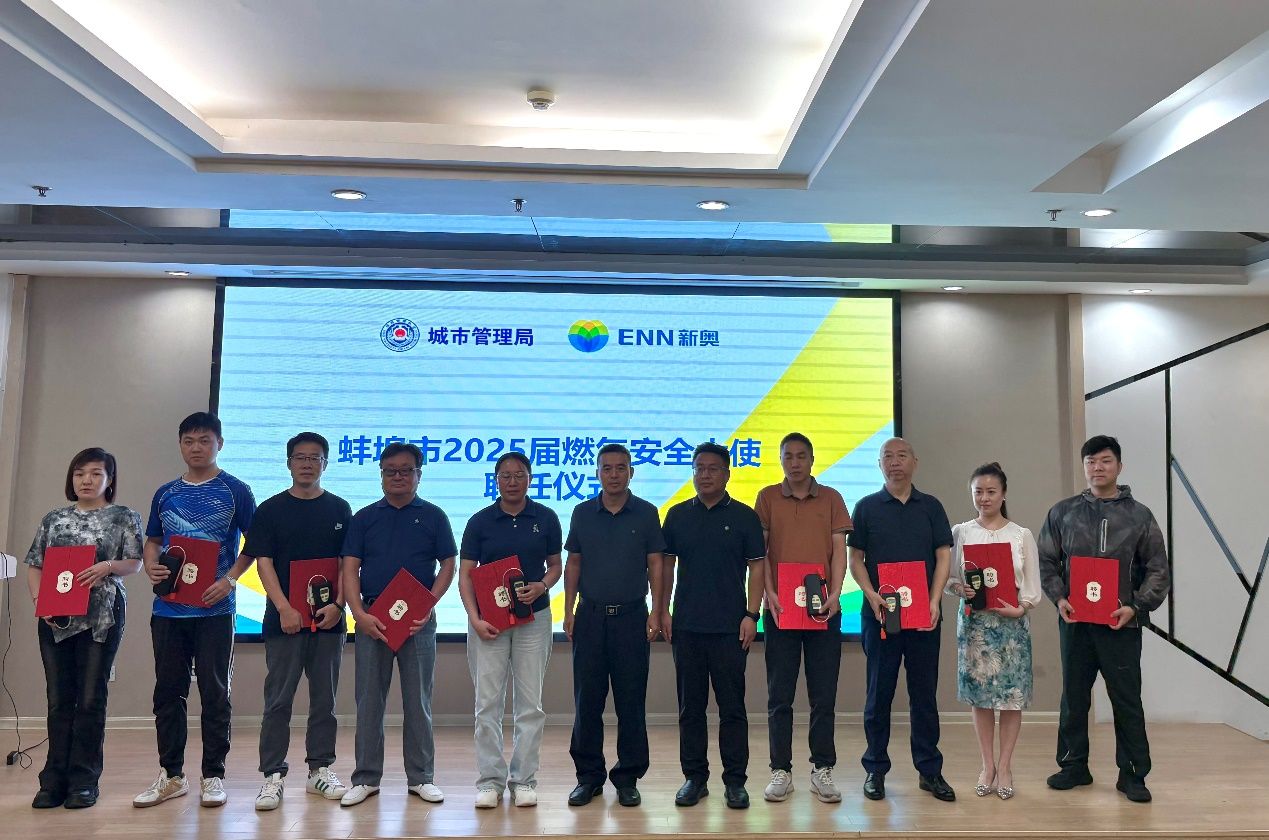 仪式现场,市城管局领导汪春群、高建、新奥能源安徽区域安全总监徐友林、蚌埠新奥总经理助理苏刚共同为“燃气安全大使”颁发聘任证书并发放燃气测漏仪。蚌埠新奥安全副总监徐永恩在致辞中强调,燃气安全事关群众生命财产安全,“安全大使”队伍的组建,是打通燃气安全宣传“最后一公里”的重要举措,公司将为“安全大使”提供专业培训与宣传物资支持,推动安全知识精准触达社区、学校、商户等重点场景。