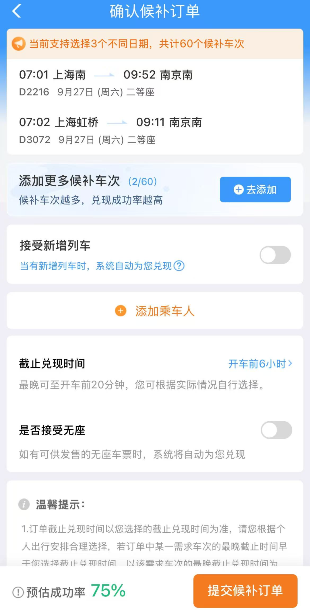 2.支持添加更多候补车次。每个用户同时可以保有6个待兑现候补订单;每个候补订单最多可选择3个乘车日期,总计添加不超过60个车次;最多可添加9位乘车人;候补订单截止兑现时间为不晚于开车前20分钟。