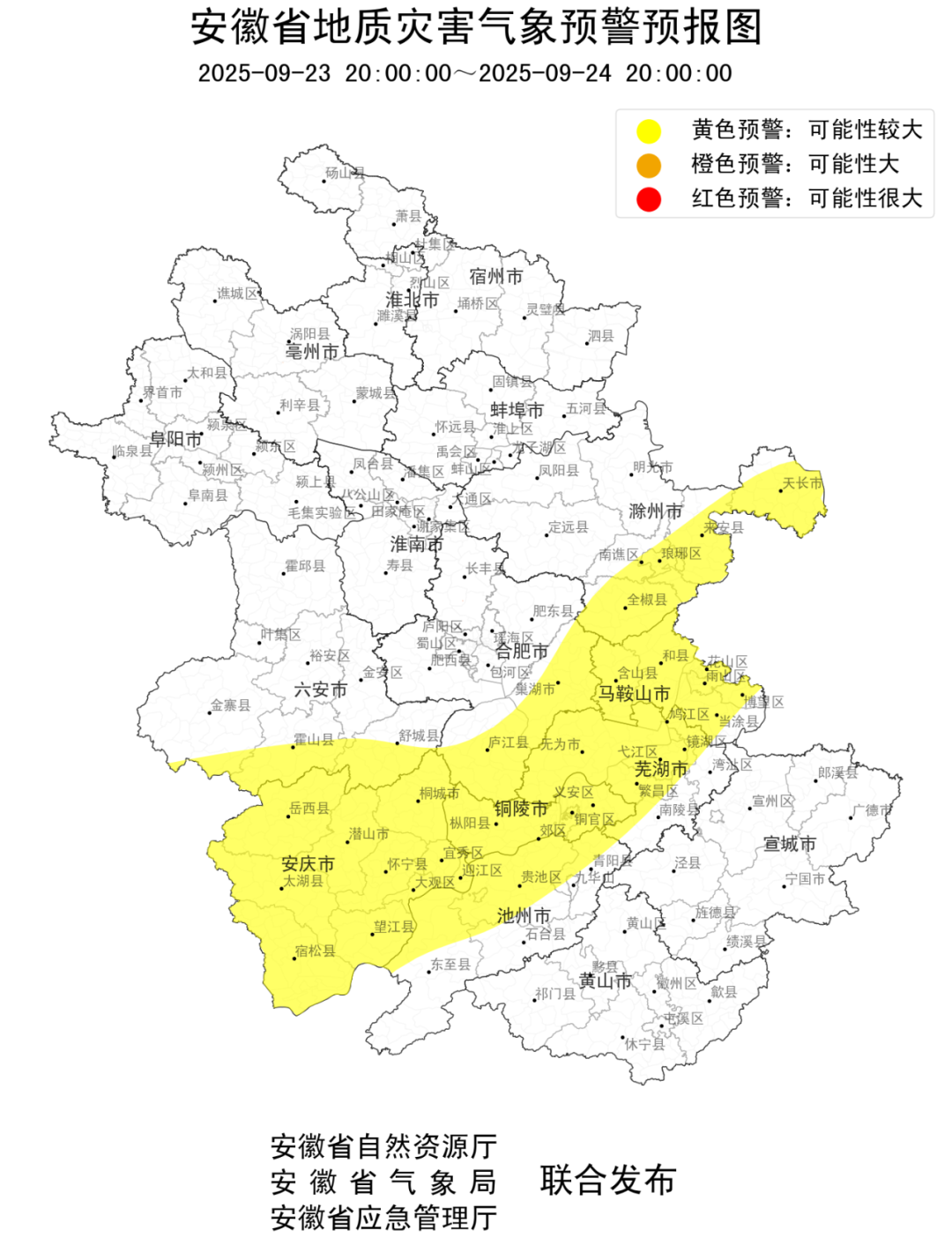 9月23日,安徽省自然资源厅、安徽省气象局、安徽省应急管理厅联合发布地质灾害黄色预警:9月23日20时至9月24日20时,安庆市全境、池州市全境、铜陵市全境、芜湖市全境、马鞍山市全境、六安市金寨县、霍山县、舒城县,滁州市天长市、琅琊区、南谯区、来安县、全椒县,合肥市巢湖市、庐江县发生地质灾害可能性较大,请注意防范,并加强隐患巡查和排查,一旦发现隐患,提前避险转移。