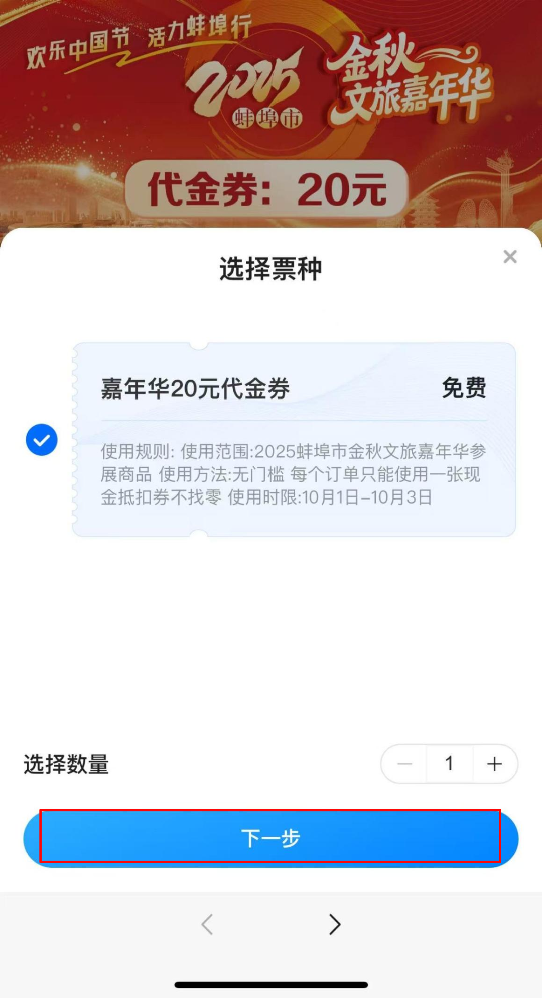 Step3:选择嘉年华20元代金券,数量默认为1,点击“下一步”