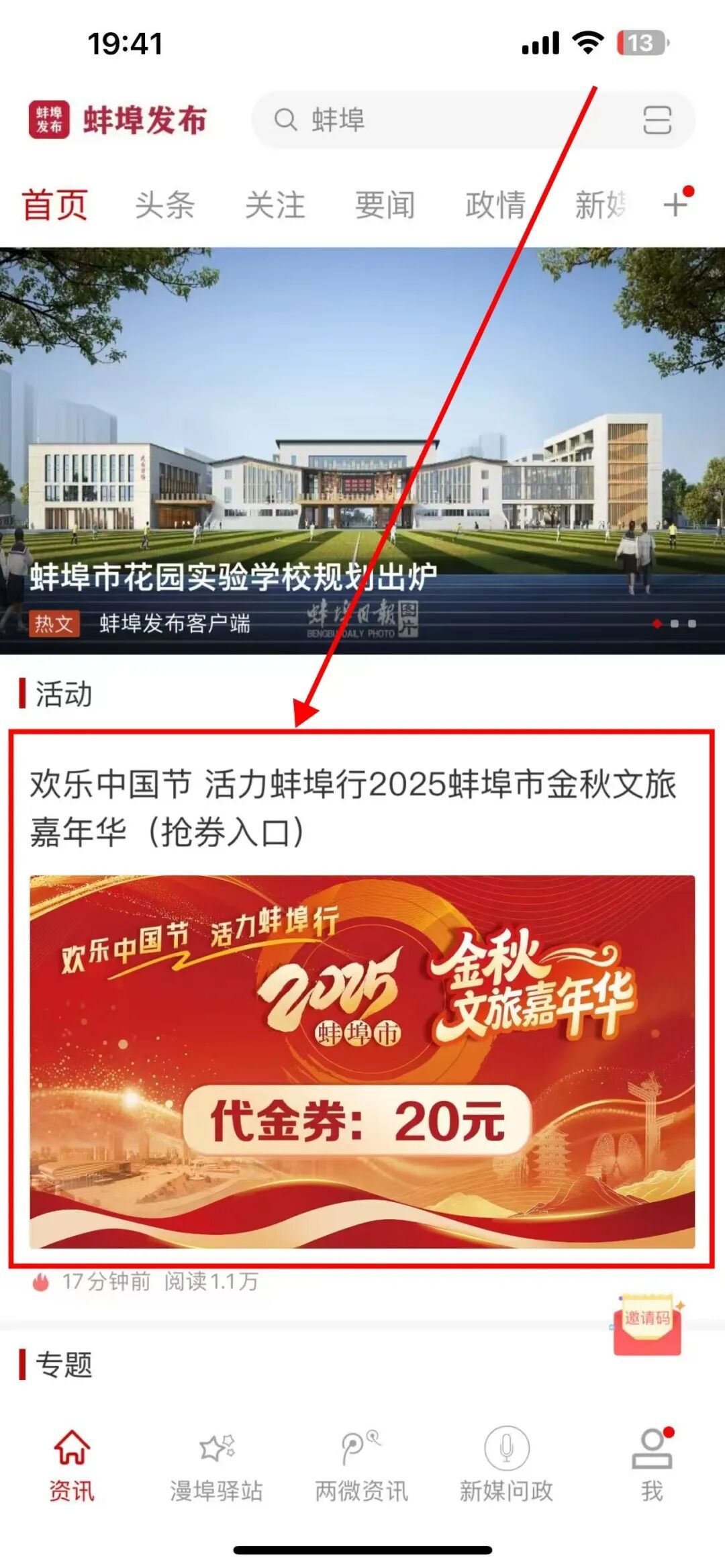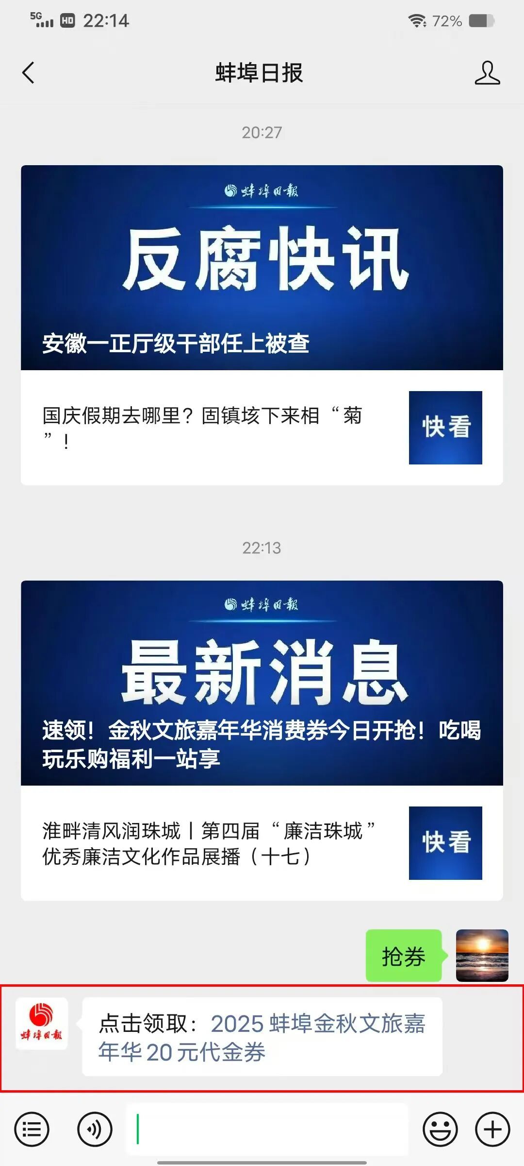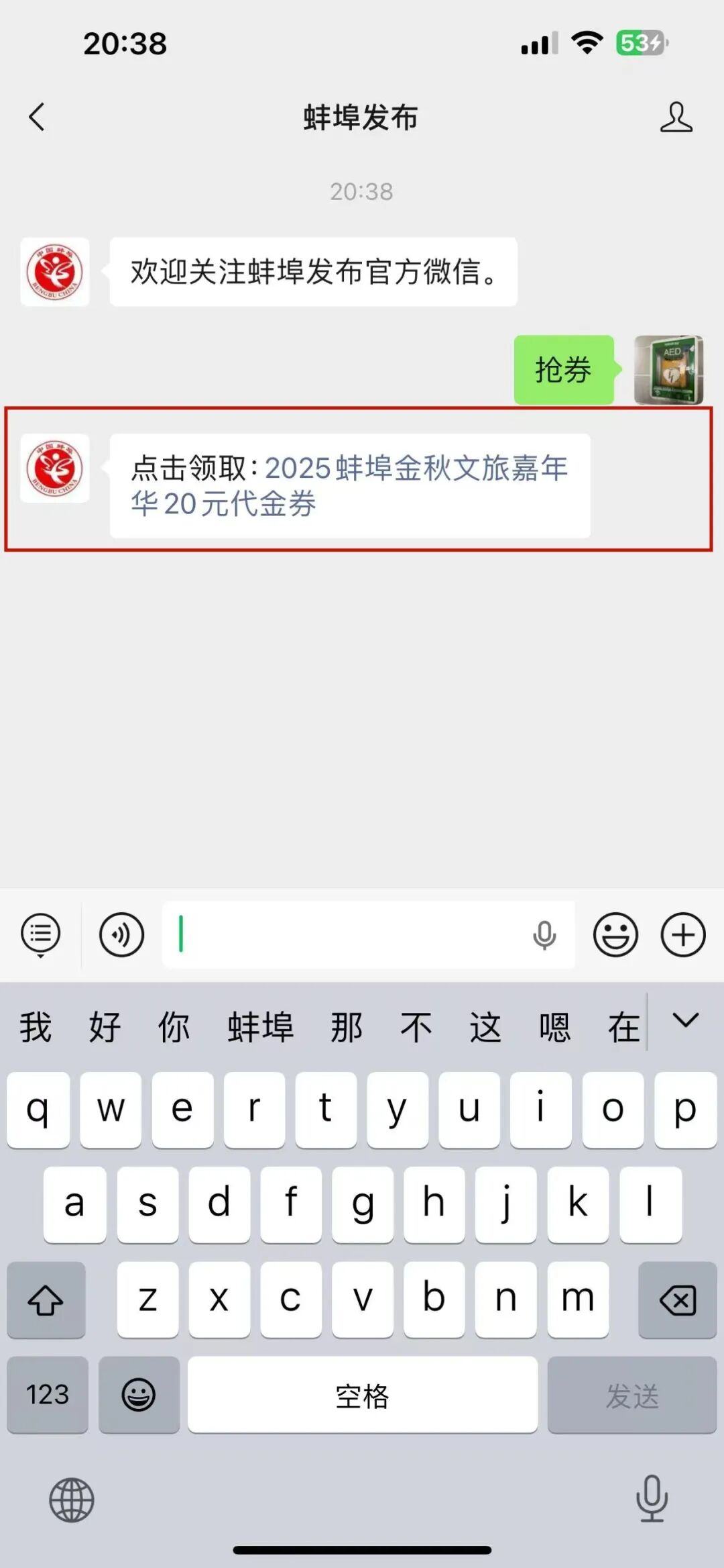 Step1:关注蚌埠发布、蚌埠日报、最蚌埠微信公众号,回复“抢券”,或下载蚌埠发布APP点击“抢券入口”。