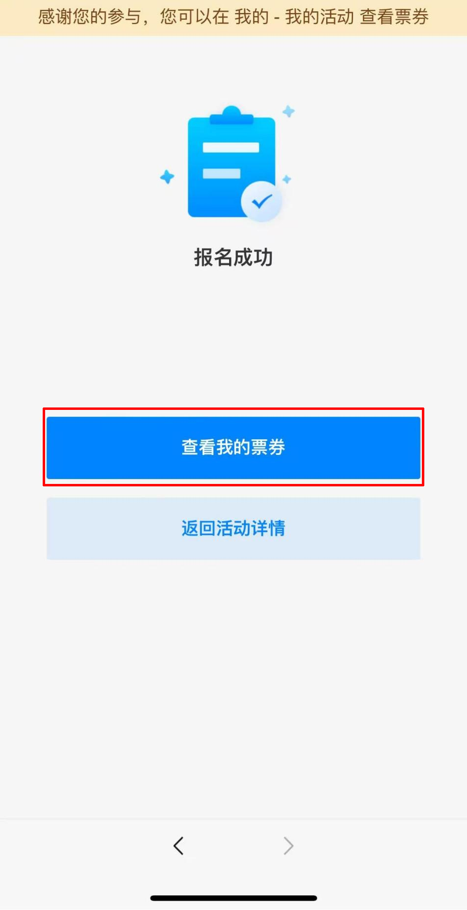 Step5:报名成功,点击“查看我的票券”即可查看电子票券凭证