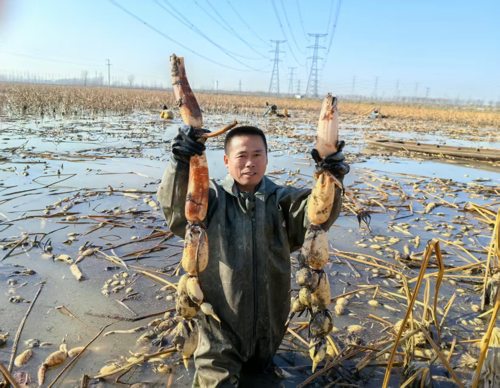 采收现场,采藕工翟连伟和同伴们正忙得汗流浃背。他们7人自带柴油机和水枪,专程赶来帮工。“这儿泥层深,藕难挖,工钱按斤算,每斤4毛。”翟连伟抹了把汗笑道,“手快的一天能挖1700多斤,挣700块钱没问题。”这份季节性高收入,吸引了周边不少村民参与,成为农闲时节增收的重要来源。