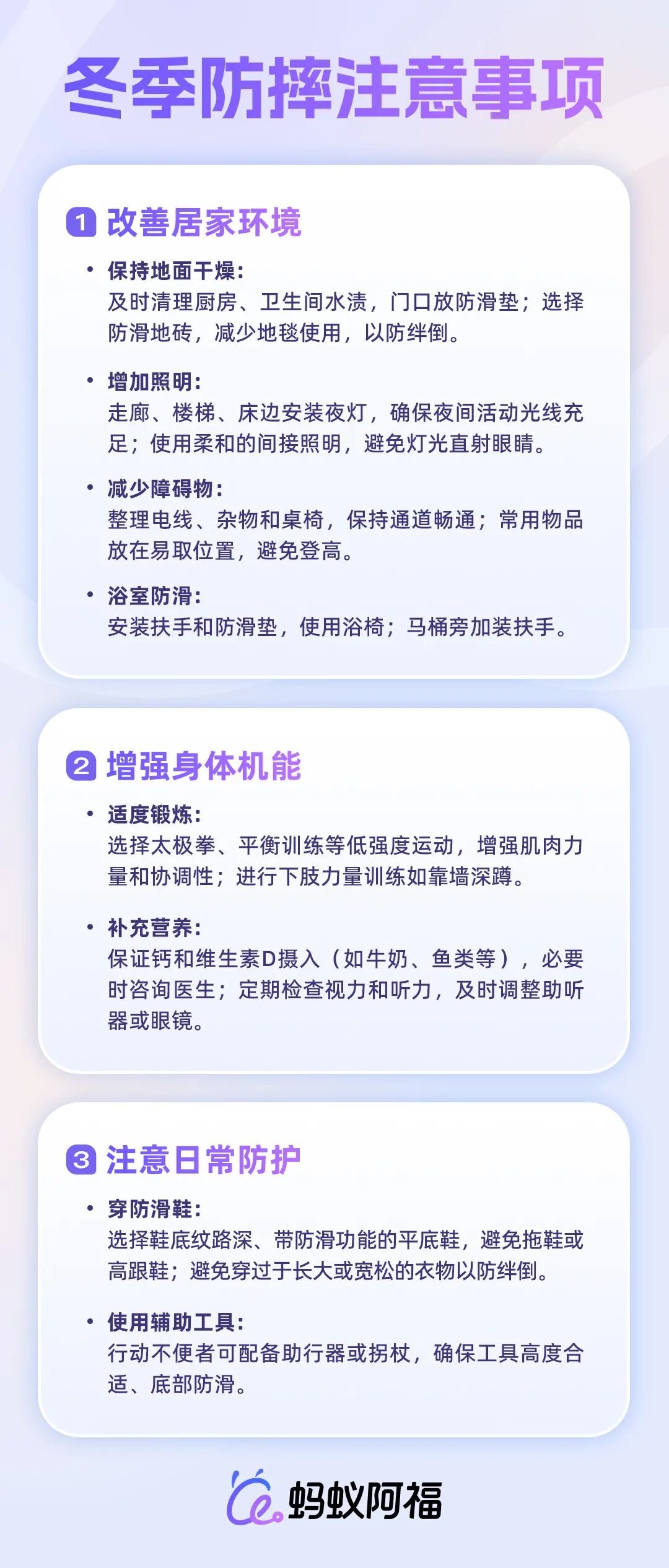 冬季干燥寒冷、日照时间缩短,对于老人等特殊群体,跌倒的风险增大,而跌倒对老人的影响可能是灾难性的。