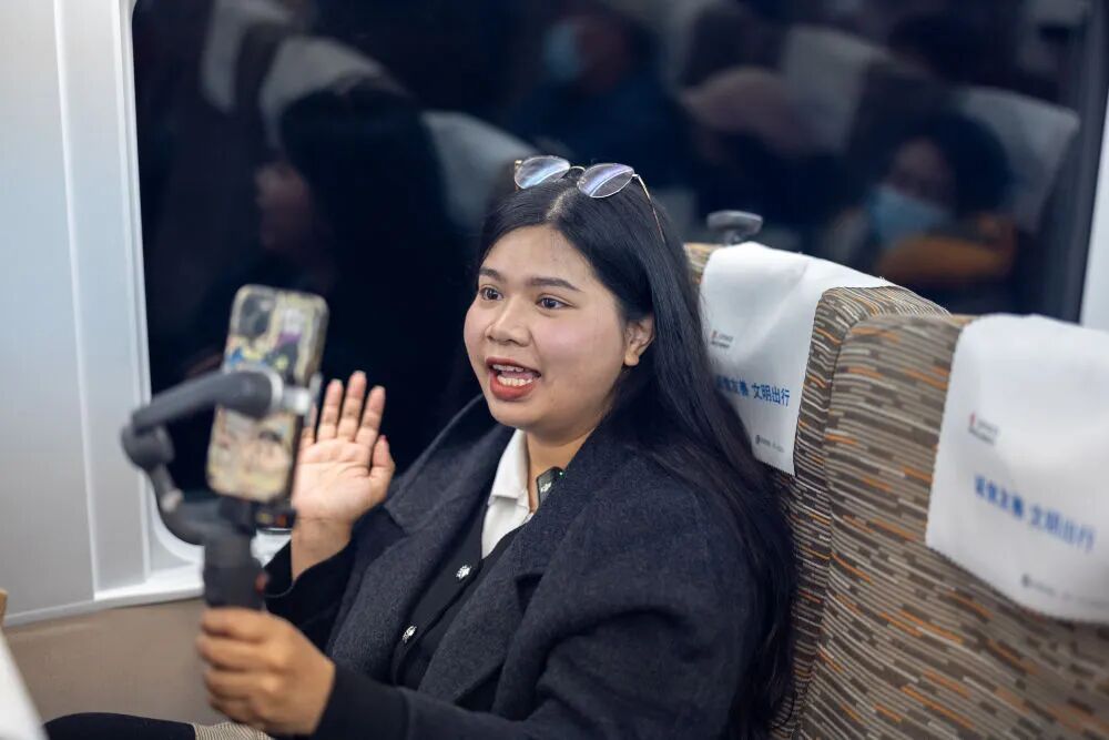 2025年2月21日,泰国博主李佩英在中国拍摄体验复兴号高铁列车。新华社记者黄伟摄