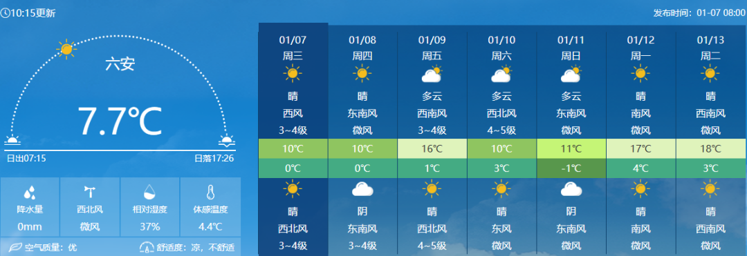 像六安,9日最高气温16℃,最低气温仅1℃,昼夜温差可达15℃;合肥,13日昼夜温差更是高达18℃,早晚时段出行需加强保暖措施。