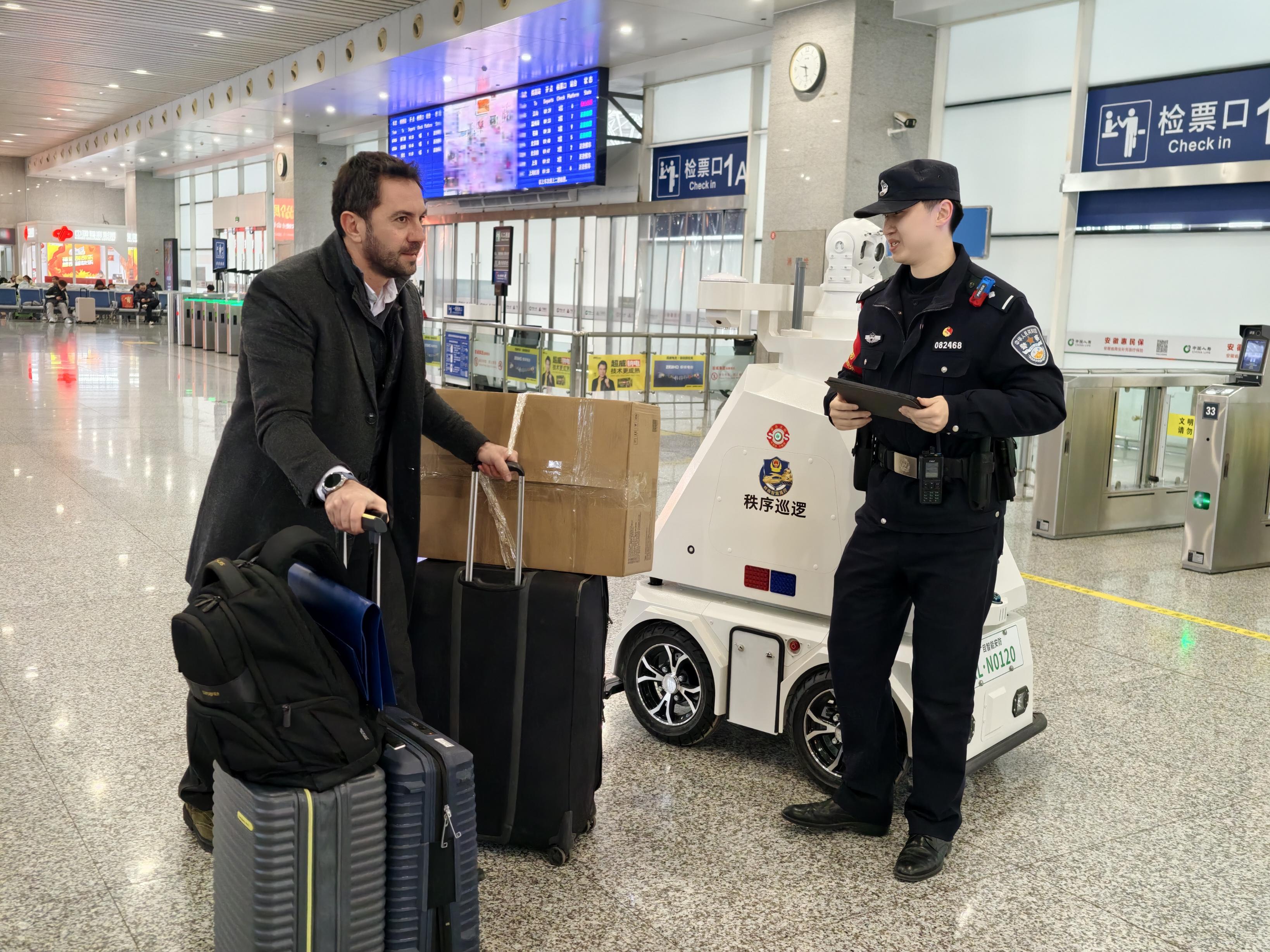 除了安防功能,这台机器人还兼具便民服务属性。通过语音播报系统和交互大屏,它能循环播放反诈知识、乘车安全须知等内容,同时为旅客提供车次查询、路线引导等服务,在提升安保效能的同时,优化旅客出行体验。