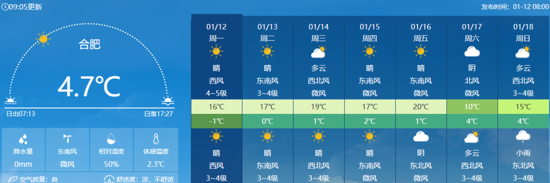 安徽省气象台预计,12日至16日白天全省以晴到多云天气为主。