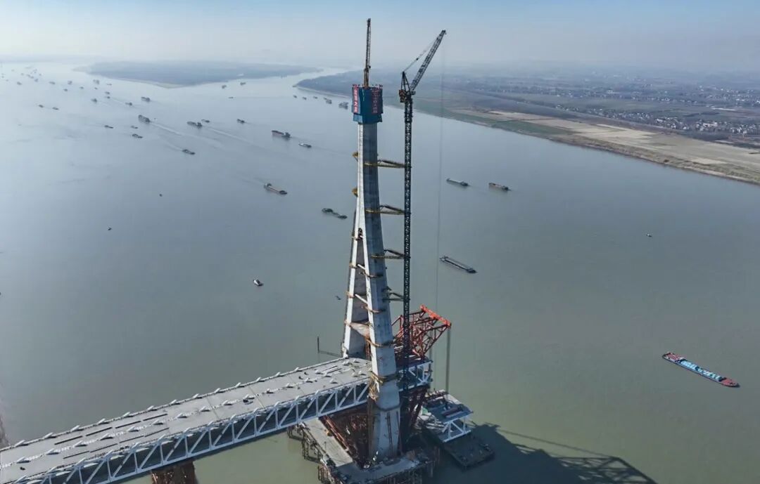 1月15日,在长江安徽段池州侧离岸380米的江面上,伴随着最后一方混凝土被泵送至272.7米的高空入模,池州长江公铁大桥4号主塔顺利完成封顶。这也是该桥两座主塔中首个封顶的主塔。