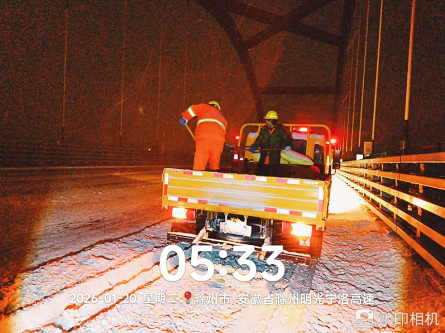 闻雪而动,全线出击。降雪伊始,各高速路段监控中心实时关注路面温度与积雪情况,及时通过可变情报板、导航软件联动,及时向司乘人员发布路况信息和安全提示,引导车辆安全通行。在蚌明高速,大型综合除雪车组成梯队作业模式,采取“机械为主、人工为辅”的方式,对桥梁、弯道、陡坡等重点路段撒布融雪剂。截至20日上午10时,各高速经营单位共投入应急人员365人次,出动机械237台班,撒布融雪剂655吨,实现了“雪中路通、雪停路清”的目标。