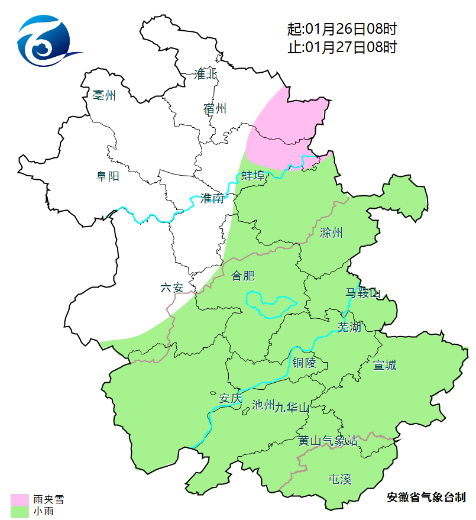 26日(周一):全省阴天。淮河以北东部有雨夹雪,淮河以南大部分地区有小雨。